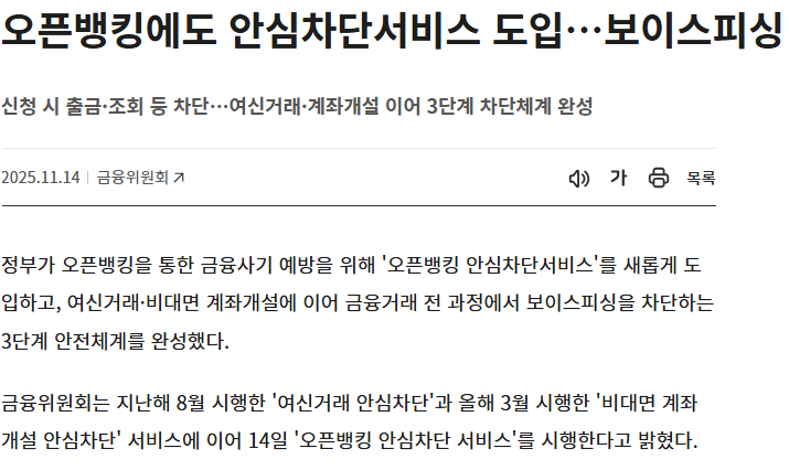 보이스피싱이 해외 조직을 중심으로 대형화·지능화되면서, 계좌도용·오픈뱅킹 악용 사고가 최근 몇 년 사이 급격히 증가하고 있습니다. 이에 금융당국은 기존에 운영하던 여신거래 안심차단(2024년 8월), 비대면 계좌개설 안심차단(2025년 3월)에 이어, 2025년 11월 오픈뱅킹 안심차단서비스를 시행하며 금융거래 단계별 '3단계 사전 차단 시스템'을 완성했습니다. 이 서비스는 오픈뱅킹을 아예 사용할 수 없도록 선택적으로 차단하는 강력한 보안장치로, 피해 확산을 사전에 막기 위해 반드시 이해해야 할 사항이 많습니다. 아래에서는 서비스 사용 전 반드시 알아야 할 5가지 핵심 포인트를 정리했습니다.