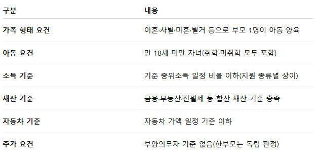 한부모가정은 기본적으로 부모 중 1명이 미성년 자녀를 양육하고 있으면서, 법에서 정한 소득·재산 기준을 충족해야 인정됩니다.