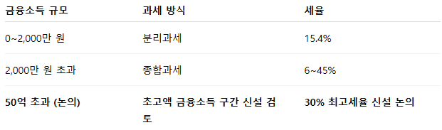 📌 [표 2] 2025 금융소득 과세 구간 + 50억 초과 논의 반영