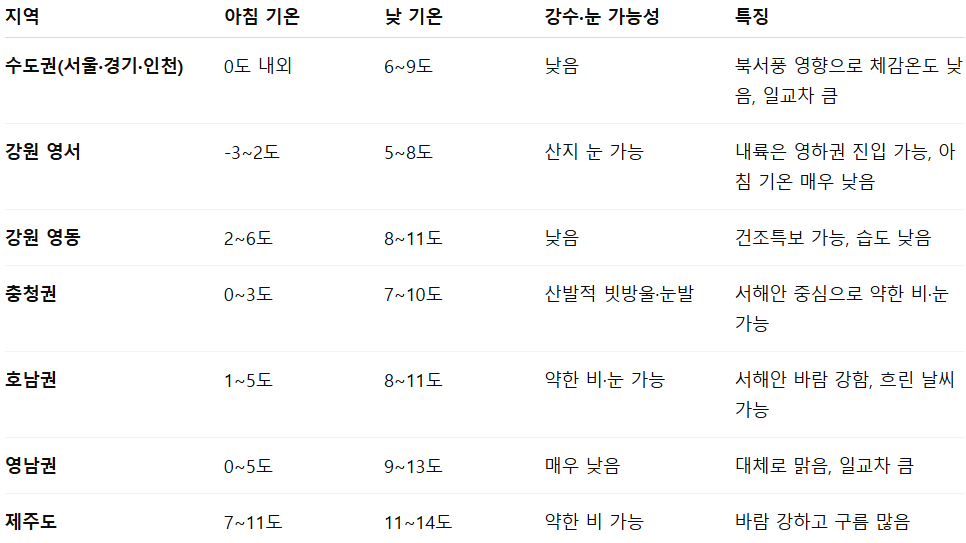 아래는 12월 첫째 주 평균 기후와 기상 패턴을 기준으로 정리한 지역별 예상 흐름입니다.