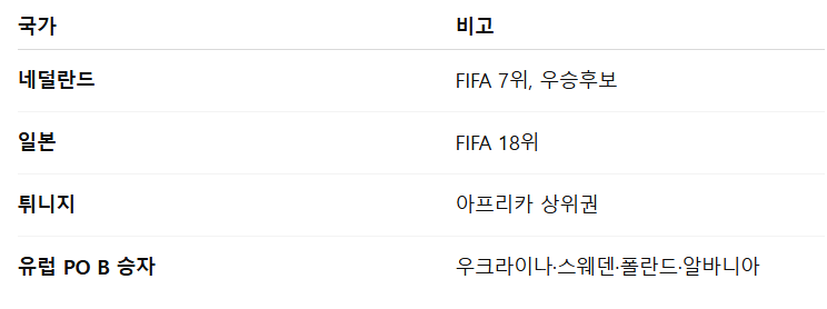 반면 일본은 네덜란드·튀니지·유럽 PO B 승자와 함께 F조에 편성되며