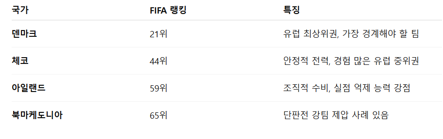 나머지 3팀(체코·아일랜드·북마케도니아)은 한국보다 랭킹이 낮음